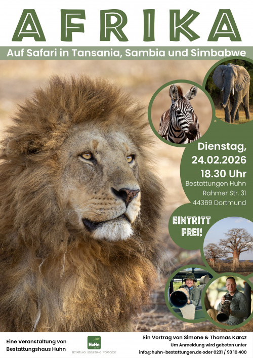SAVE THE DATE! Am 24. Februar besuchen uns Simone und Thomas Karcz und erzählen von ihren spannenden Reisen durch Afrika. Ein Vortrag mit atemberaubenden Bildern, toller Musik und vielen Infos erwartet Sie. Kommen Sie uns besuchen und lassen Sie uns gemeinsam einen schönen Abend verbringen. Um Voranmeldung unter info@huhn-bestattungen.de oder 0231 - 93 10 400 wird gebeten! |